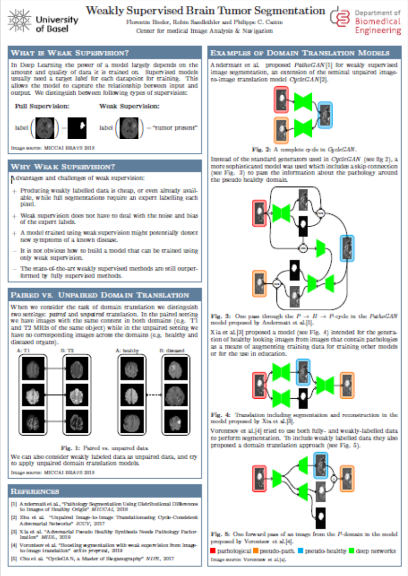 We seek to solve this problem by using weak supervision: We are developing methods that do not need reference segmentations - instead we try to leverage the distributional differences in images of patients that exhibit symptoms of a disease and images of a healthy control group. Specifically we try to detect and segment brain tumors in MRI scans.